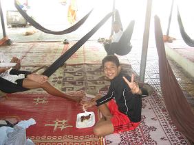 いつもはテーブルと椅子がある場所を借りますが、昨日行った所はいつもと違う場所だったので、ゴザ(クメール語ではコンテール)とハンモックというスタイル。