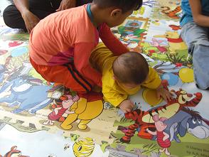 DN君も6ヶ月になって体を動かし始めて、タイルの上に敷くとちょうどいい「ハイハイ」出来るスペースに・・・。