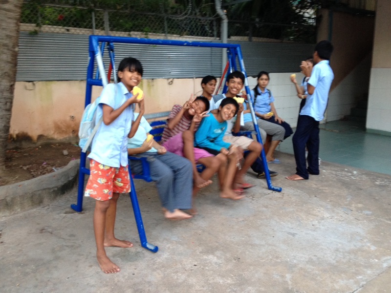 ご支援により、設置されたブランコはみんな本当に大好きです。大きい子も小さい子もなかよく座っています。